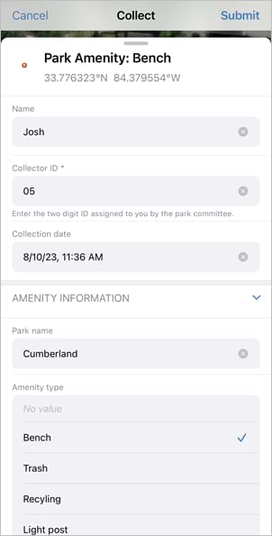 Step 13: Center the location target on the location of the new park bench and tap Add Point, and then tap Submit.