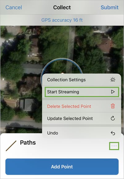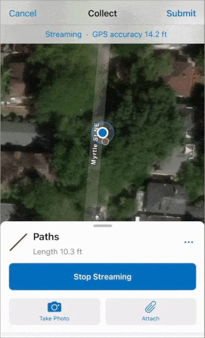 To collect the path, you’ll use a feature called streaming. When you start streaming, you can walk along the path while Field Maps automatically drops vertices that form the line feature you’re collecting.