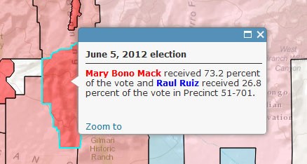 Using color in your web map pop-ups can offer more meaning and context to the information presented within them and make your pop-ups stand out. In the example below, a pop-up in a 2012 election map highlights the Republican candidate’s name in red and the Democratic candidate’s name in blue.