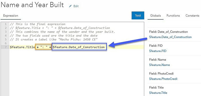 Click the blue Test button to see how your label will look. The Arcade expression combines multiple fields and returns a label like “Taj Mahal: 1643 CE”.