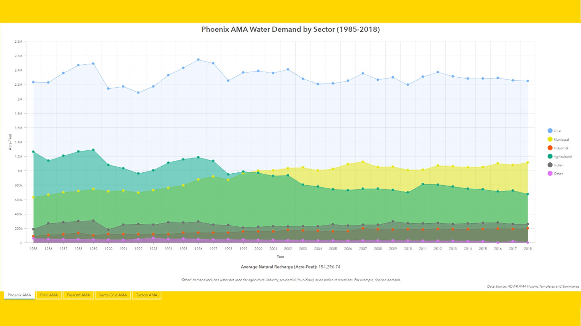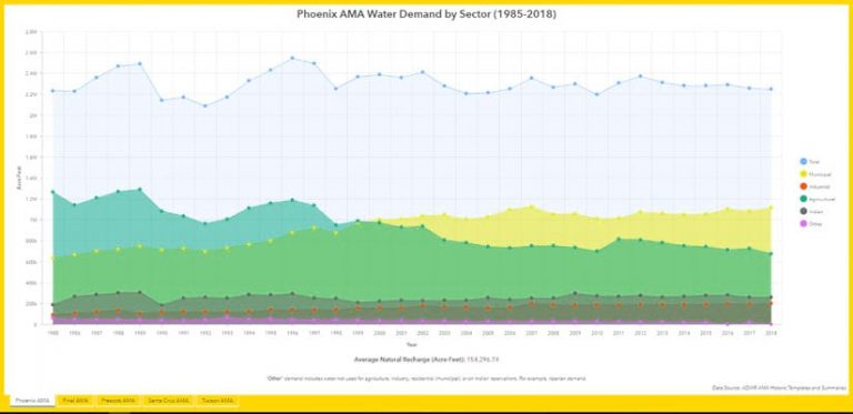 People who use the Arizona Water Blueprint Viewer can also examine other data in greater detail. For example, ArcGIS Dashboards was used to create tables such as this one that displays water demand in the state’s Active Management Areas (AMAs) by sector from 1985 to 2018. AMAs are specially designated areas in the state that faced water overdrafts and must be rigorously managed.