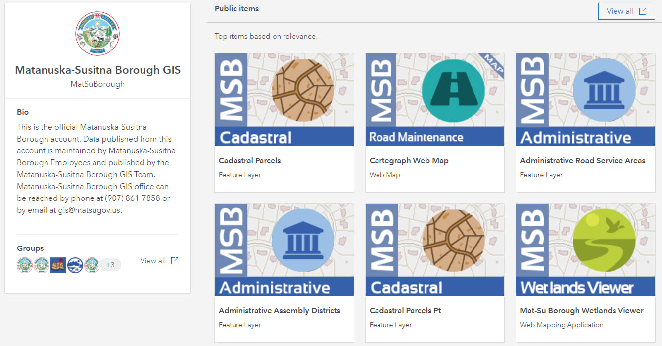 This example of a profile from Matanuska-Susitna Borough GIS includes easy-to-identify item thumbnails, which combine to create an impression of professionalism and curated content.
