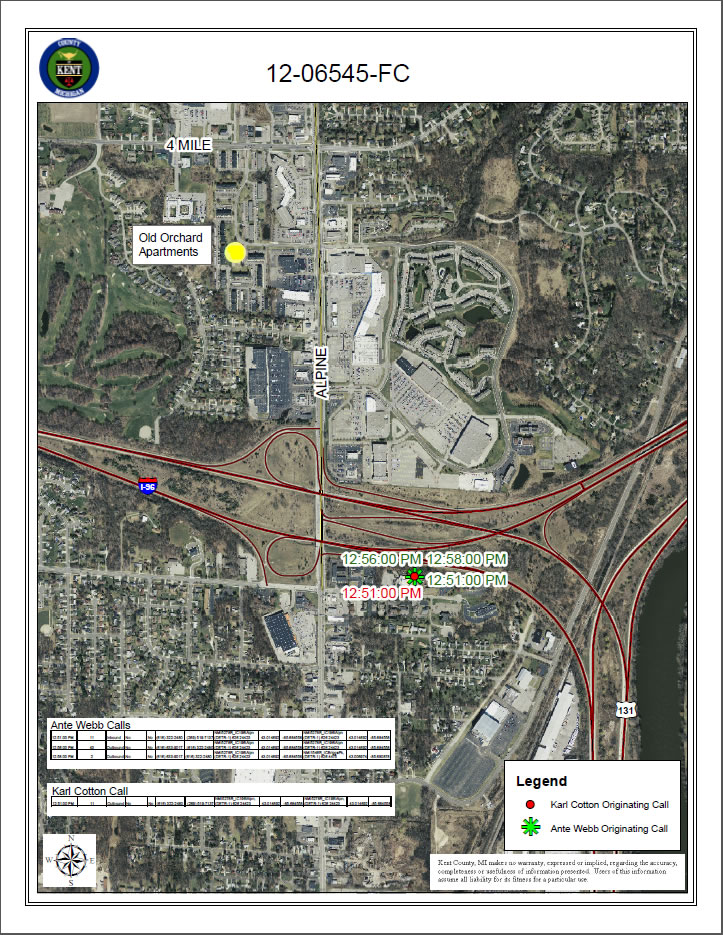 The maps, which were entered as evidence at Cotton’s trial, were made by the Kent County, Michigan, GIS department. They showed that Cotton’s cell phone records placed him close to the apartment where and when the murder occurred. The mapped locations of the other suspects in the case showed they were much further away.