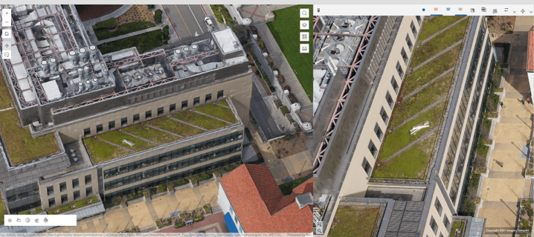 An Esri-certified drone operator planned and managed the flight using ArcGIS Flight. The Esri team then stitched the photos together using Esri’s photogrammetry software, Site Scan for ArcGIS, which allowed for flexible processing in the cloud and creation of imagery products using solutions such as True Orthophotos, digital surface models, point clouds, and 3D meshes. Esri staff then embedded the imagery products into ArcGIS Experience Builder, with features such as orthomosaics, 3D textured meshes, and an oriented imagery viewer–used for later review by the facilities services department and other drone stakeholders at the university.