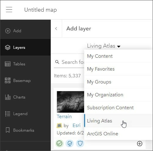 Step 4: Click My Content and choose Living Atlas from the drop-down menu.