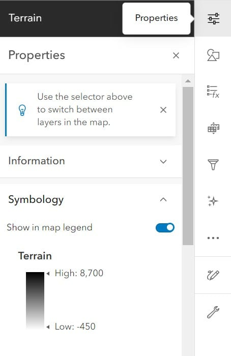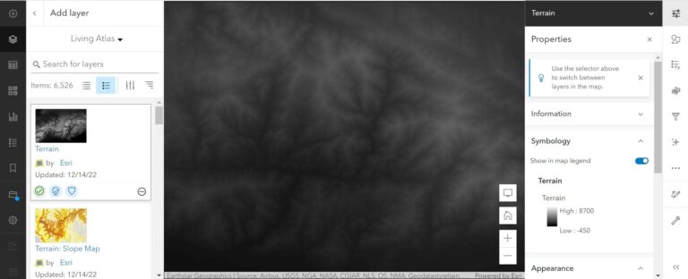 This is an image service from ArcGIS Living Atlas of the World. It’s a digital elevation model that covers the whole world at every scale. Darker areas are lower elevation, and lighter areas are higher elevation. But you aren’t stuck with this color scheme in ArcGIS Online.