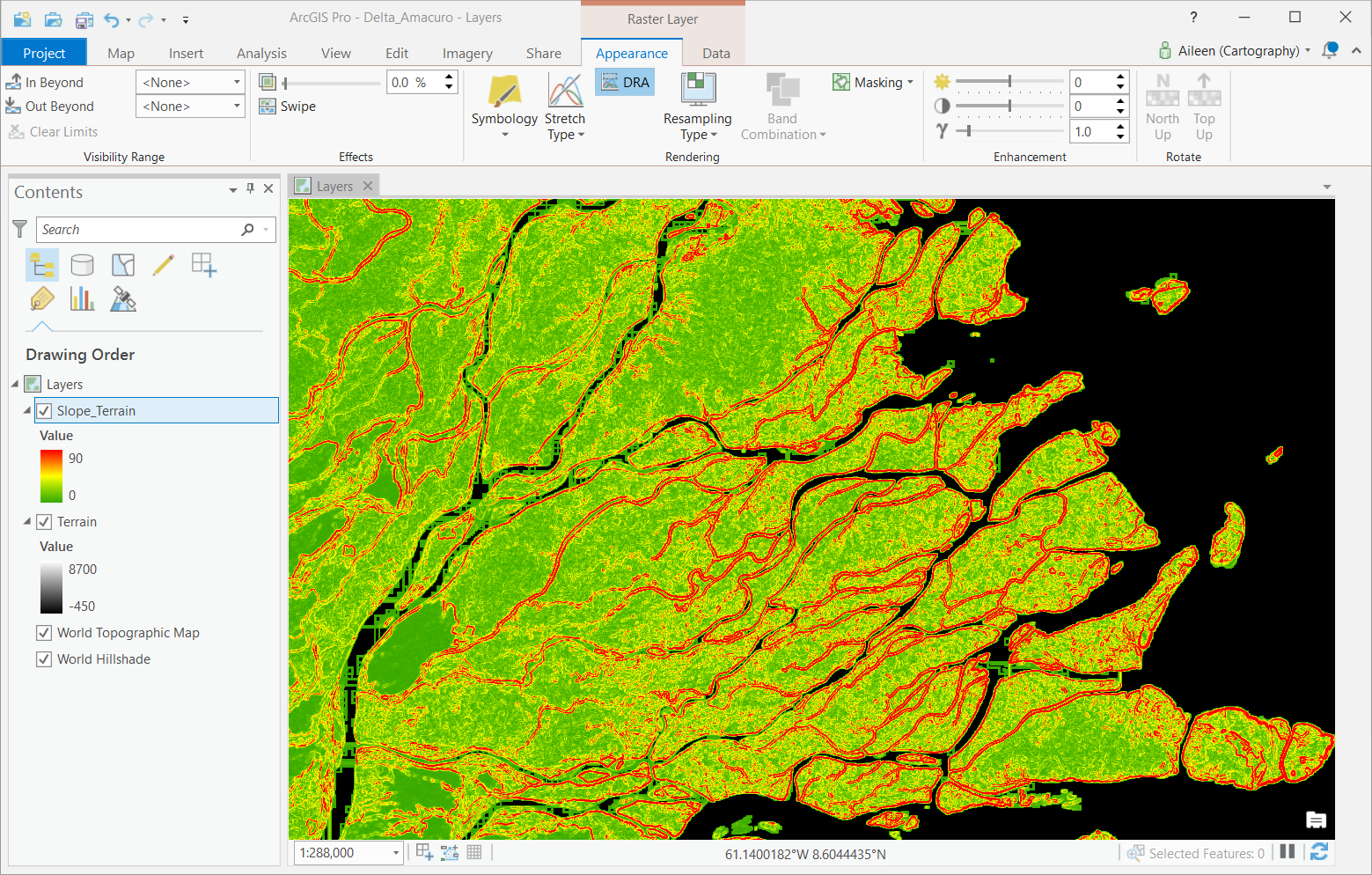 The slope layer reveals some interesting characteristics of the low-lying river delta that are not apparent on the topographic basemap. You can use the Swipe tool to compare features on the topographic basemap with those on the final map.