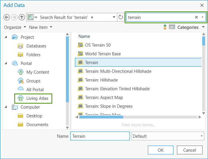 Step 2. In the Layer group on the Map tab, click the Add Data icon. In the left pane of the Add Data dialog box, select Living Atlas under Portal. If necessary, use Search at the upper right to locate the Terrain layer (choose the layer that is simply named Terrain, not other layers with Terrain as part of the name) and add it.