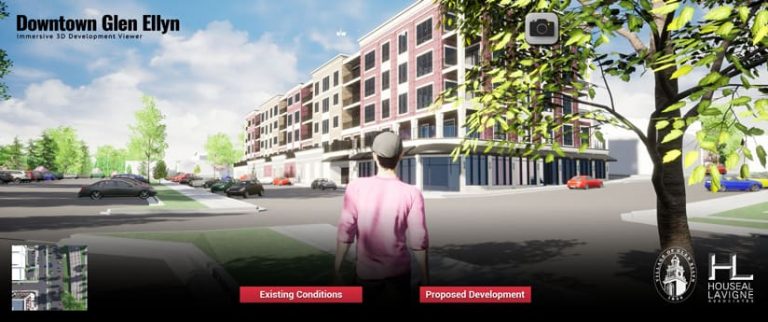 To help the Glen Ellyn Village Board of Trustees envision what the new building would look like from various locations on the ground, the urban planning and design firm Houseal Lavigne Associates got creative by developing an immersive 3D game-like environment for viewing the proposed development.