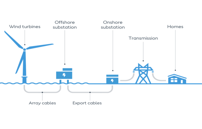 Electricity generated by its offshore wind farms is conducted by array cables that are trenched into the seabed and send the energy to an offshore converter station. The converter station has an export cable that sends the electricity to an onshore transition joint bay and cable. It is then transmitted to a substation and distributed to an electricity grid for consumption.