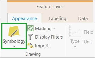 - In the Drawing group in the main menu, click On the Appearance tab in the Feature Layer contextual tab, on the Appearance tab, in the Drawing group, then click the Symbology button ().