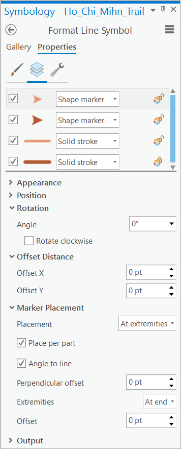 7. Under Appearance, for each symbol layer, change the color to match Sihanouk_Trail (final symbol) or any other desired color for the final symbol to create the desired symbol.