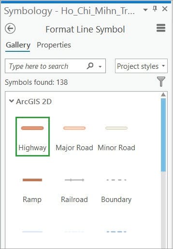 - At the top of the Format Line Symbol pane, click the Gallery tab and then click the Highway symbol to select it.