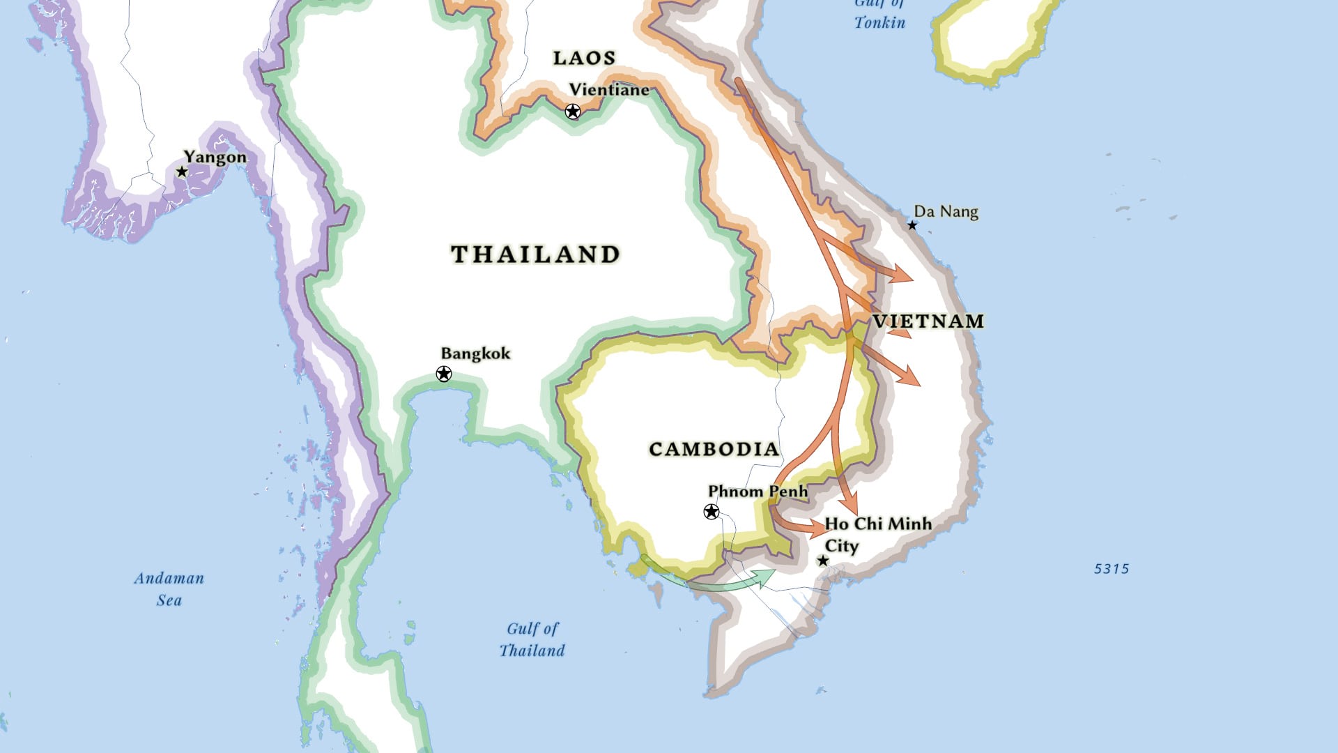 For example, on this map showing current political boundaries (below), arrowheads indicate the direction of the flow of military caches and other supplies from North Vietnam and Cambodia to the Vietcong in South Vietnam during the Vietnam War period (1955-1975). (The original source for information on the location of these supply lines is The Making of America: The History of the United States from 1492 to the Present by Robert D. Johnson and published by National Geographic.)