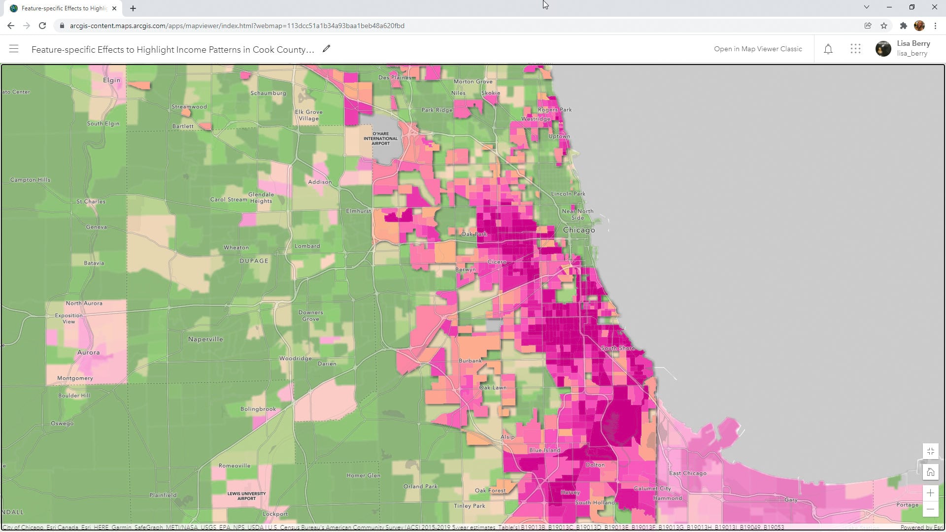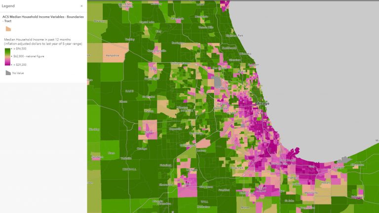Step 1: Open this web map of the Chicago metropolitan area, which contains a layer from ArcGIS Living Atlas of the World depicting the US Census Bureau’s median household income values for all US census tracts. The census data in this map is sourced by the American Community Survey (ACS), and the map uses the human geography basemap, which is ideal when mapping thematic data such as demographics within tract polygons.