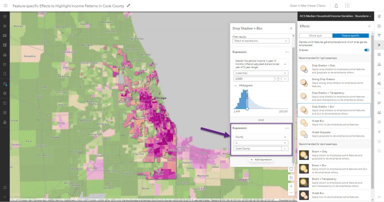 While this map is informative and useful, it’s important to consider your audience when creating any map. In the scenario for this tip, Cook County, Illinois, needs an assessment of income for at-risk populations so that officials can distribute funding within the county. For this scenario, the county officials are the audience, and they need a quick way to understand which areas require funding. You can use feature-specific effects to emphasize the pink (below-average income) areas within the county and make the dark green (high income) values more subtle. This technique will draw the map reader’s eye toward the lowest-income areas so that they will understand the spatial patterns more easily.