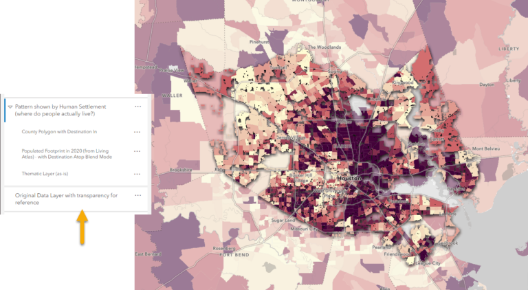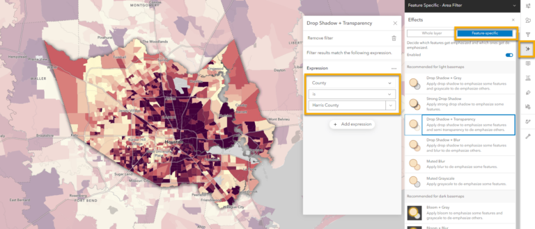 This ArcGIS Living Atlas layer contains built filter expressions that make it simple to emphasize specific areas of interest. If you don’t have a field to filter with, you can bring in an ArcGIS Living Atlas layer from the Boundaries category, and filter that layer to the area you want to show. In this case, it is filtered to Harris County.