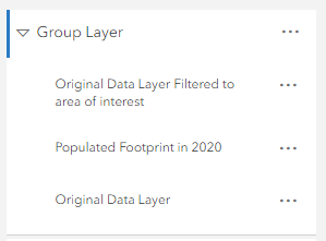 Step 4: Group the original data layer and the duplicate filtered layer with the new Populated Footprint layer by clicking the three dots beside the data layer and selecting Group, then dragging the other two layers into the grouped layer. By grouping the layers, you can add effects and blend modes without distorting your basemap or other layers in the map.