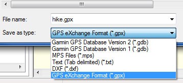 On the Save as type menu, select GPS eXchange Format as the file type. That saves the hike (the track and waypoints) as a GPX file.