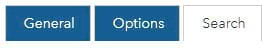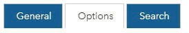 The configuration panel provides three tabs used to configure the app: General, Options, and Search.