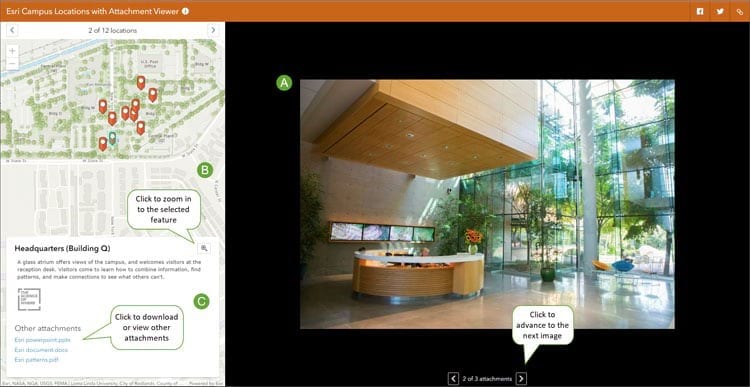 In this tip, you will learn how to use the Attachment Viewer configurable app template currently available in ArcGIS Online and coming soon to ArcGIS Enterprise. Attachment Viewer gives you the ability to view photos and other feature attachments in the feature layer. The app gives you the ability to organize and access non-spatial items like PDFs, photos, and PowerPoint presentations from a feature—be it a point, line, or polygon—that you already have collected using field apps like Collector for ArcGIS. Attachment Viewer has three main sections: