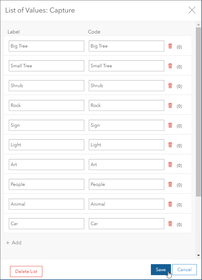In the steps that follow, you will configure the attribute fields to capture the desired information. In this example, a pre-determined list of values is needed to capture the features noted at the beginning of this article such as the trees, shrubs, rocks, and signs.
