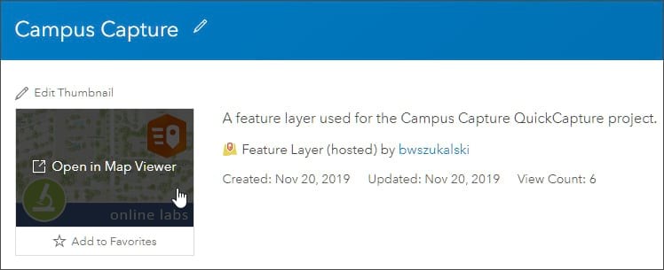 To view the QuickCapture data, find the feature layer item in your contents and click the thumbnail to Open in Map Viewer.