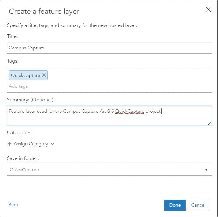 To capture the desired QuickCapture data, a feature layer is used. A feature layer can be created in many ways; one way is to use ArcGIS Pro, but for this simple example we can do everything using ArcGIS Online.