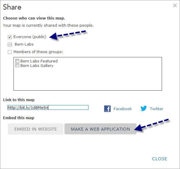 To create a map tour using Flickr photos, first author and save a new web map in ArcGIS Online. Click Share to make the map available to others in your organization or publicly, then click Make A Web Application.
