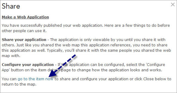 Your application is now an item in My Contents. You can go to the item now by clicking the link in the Share dialog box (which appears immediately after you click Save & Publish) as shown below: