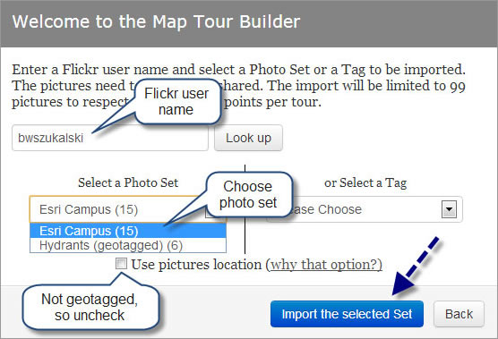 For the purposes of this tip, a map tour of the Esri campus will be created. To start, enter a Flickr user name and choose Look up. The drop down list will display all available photo sets. Choose a set and then click Import the Selected Set.
