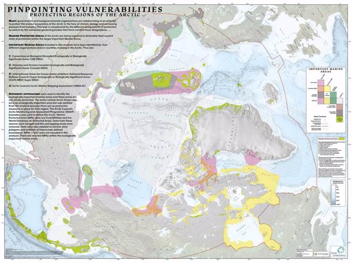 This winning entry maps protected and other important marine areas. It exhibits professionally executed cartography with subdued colors, a clear presentation of overlapping categories, and a well-balanced layout for a page with complex map marginalia.