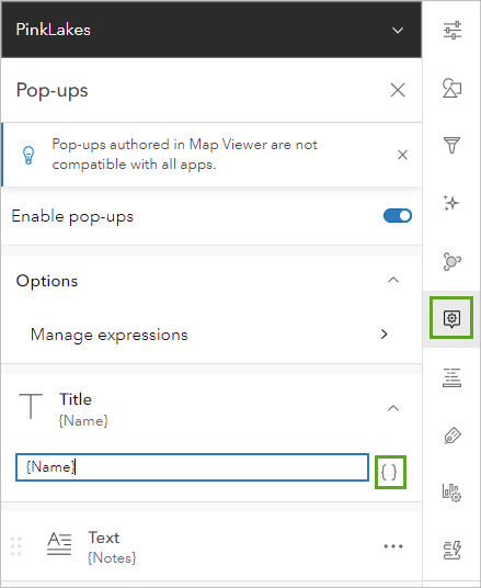 Step 1: Click Configure pop-ups. In the Pop-ups pane, click Title and then click the attribute button (identified by a pair of braces-{}), and choose the Name field.
