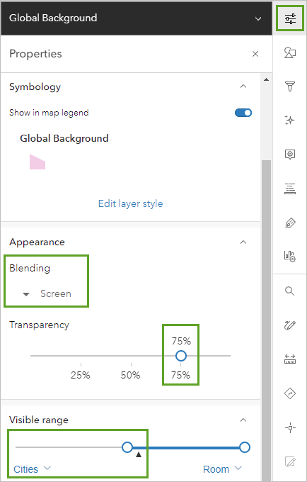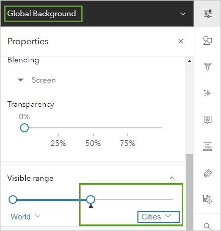 Step 10: Set Transparency to 75 percent. For Visible range, change World to Cities.
