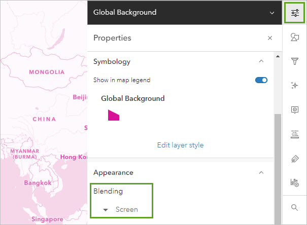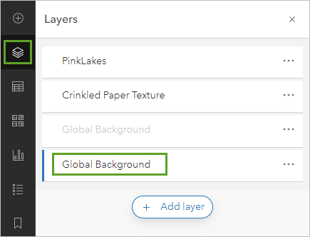 Step 7: In the Layers pane, click Add layer and add another copy of the Global Background layer from ArcGIS Living Atlas. Move it to the bottom of the layer list.
