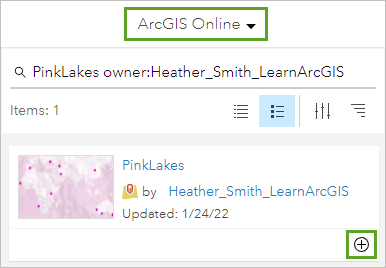 Step 8: Search ArcGIS Online for PinkLakes owner:Heather_Smith_LearnArcGIS or e7b526eed14a402cb509b5ba9119a0d2. Add the PinkLakes layer.