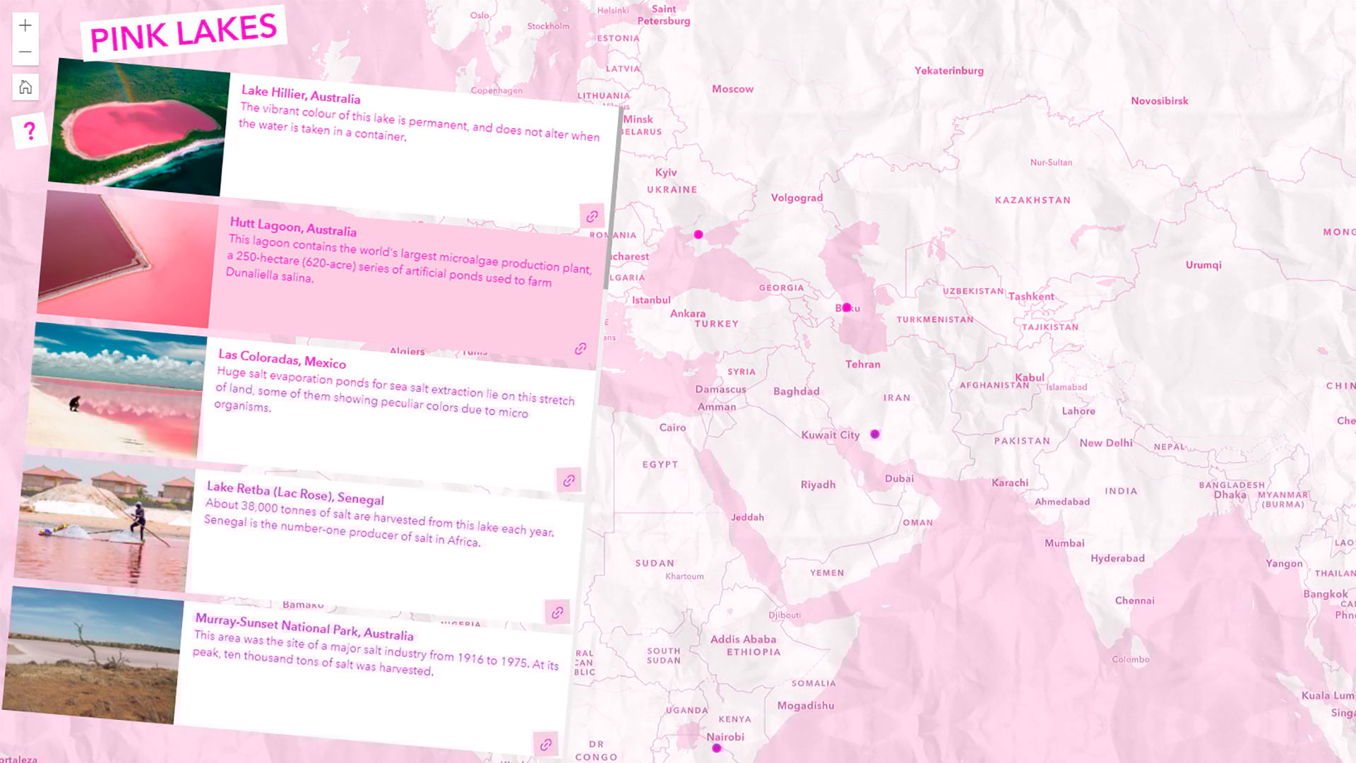 An app was built for the pink lakes map using ArcGIS Experience Builder. View the app.
