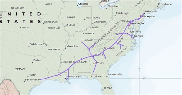 Experiment with colors, line width, different basemaps, and other settings until you get the desired results. In the map shown below, the basemap is the Charted Territories basemap, and the Colonial Pipeline is shown in purple with a line width of 2.