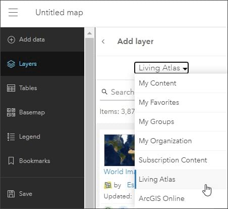 Step 2: Choose Living Atlas from the Add layer drop-down list.
