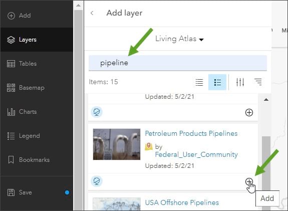 Step 3: Type pipeline in the search box, and click Enter to locate Petroleum Products Pipelines. Click (+) to add it to the map.