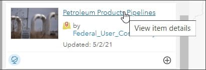 From the Petroleum Products Pipelines item details, you will see that the layer is a feature layer from the Energy Information Association (EIA). The layer publishes pipeline information for major petroleum pipelines in the United States, including pipelines that carry refined petroleum products—gasoline, jet fuel, home heating oil, and diesel fuel.