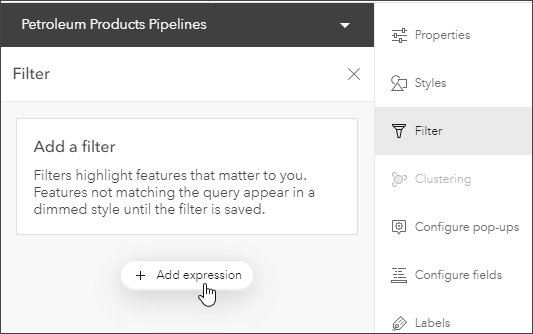 Step 5: Ensure that the Petroleum Products Pipelines layer is selected. If you are authoring a new map, this step won’t be necessary, and the layer should already be selected. If you are adding the layer to an existing map, click the layer to select it. The selected layer displays a blue highlight bar on the left.