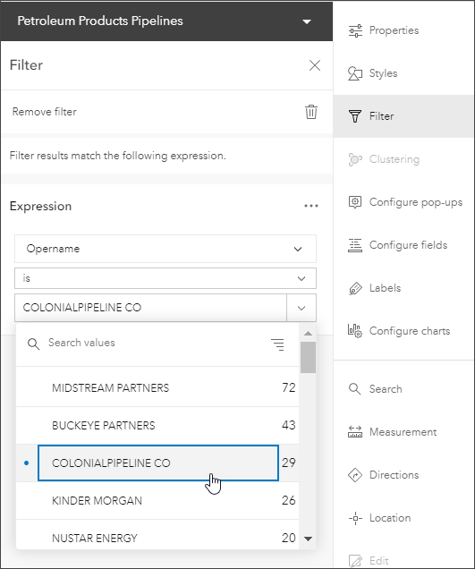 Step 8: Construct an expression using the attribute Opername and select COLONIALPIPELINE CO from the drop-down list of field values. The expression is Opername is COLONIALPIPELINE CO.