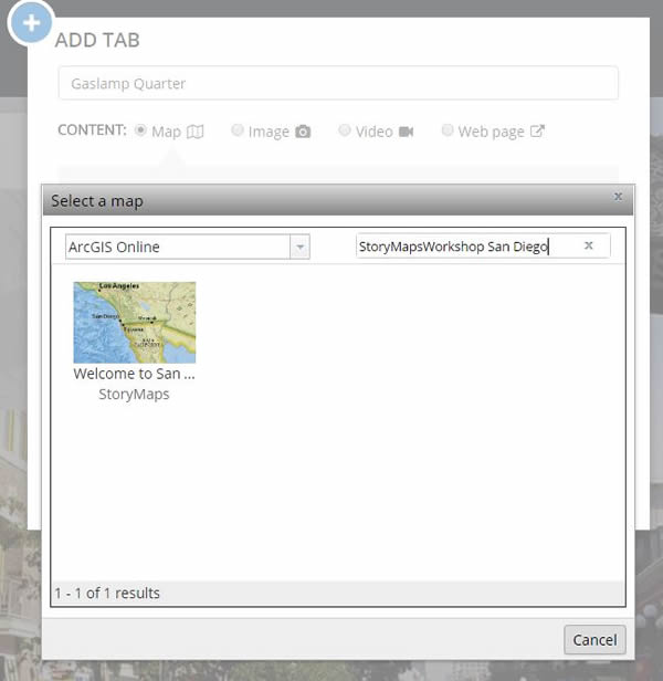 Step 6—Choose ArcGIS Online from the drop-down menu. This lets you find a publicly shared web map that someone else has created. Search for StoryMapsWorkshop San Diego and choose the Welcome to San Diego map.