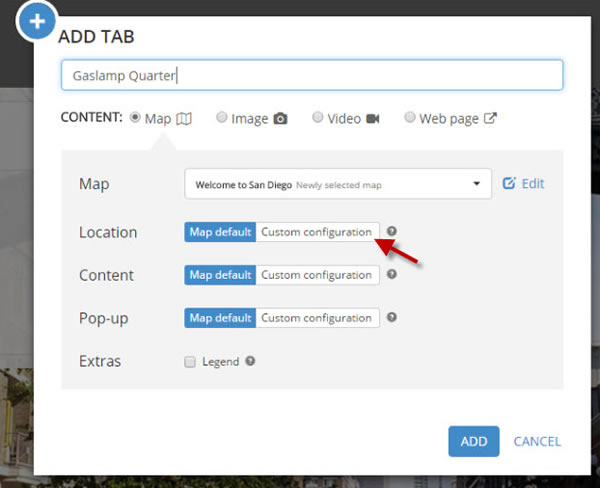 On the ADD TAB dialog box, type Gaslamp Quarter as the tab title. Next to Location, click Custom configuration (rather than Map default).