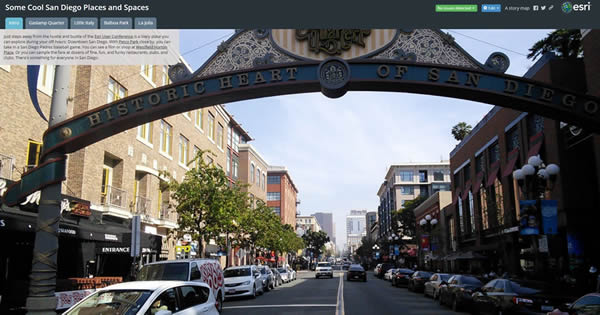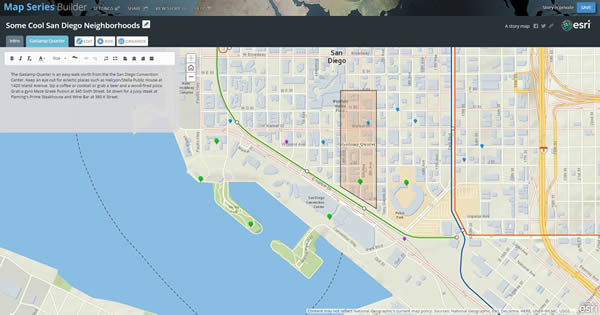 During the editing process, URL links were added in the text. Small images of the neighborhoods were placed inside the text boxes along with captions. You can also change the name of your story map. Just click the pencil icon to the right of your story map title. We did, so the Story Map Series app built for this tip is now called Some Cool San Diego Places and Spaces.