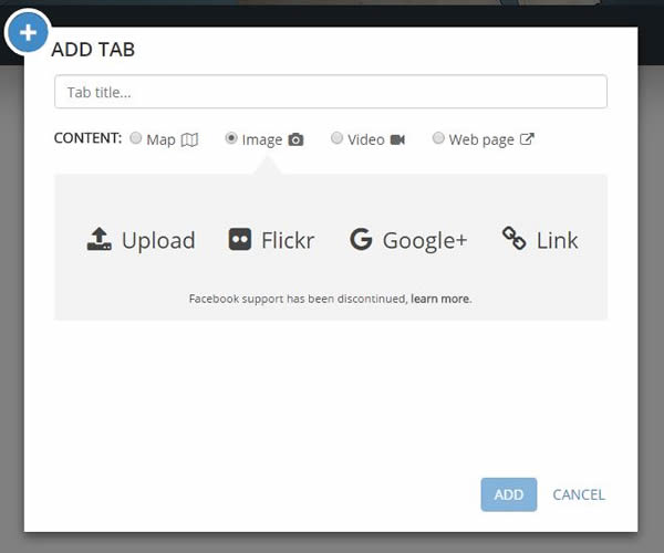 The ADD TAB dialog box opens, letting you add the first tab to your story map. Since this will be the cover of your story map, choose Image.