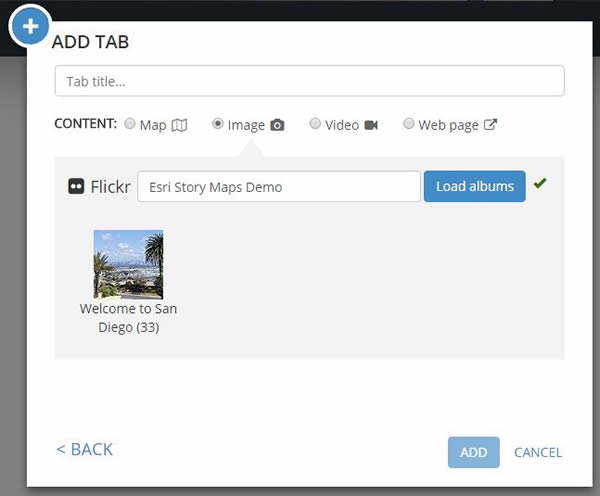 Next, select the Flickr option and type Esri Story Maps Demo in the search box. Click Load albums.