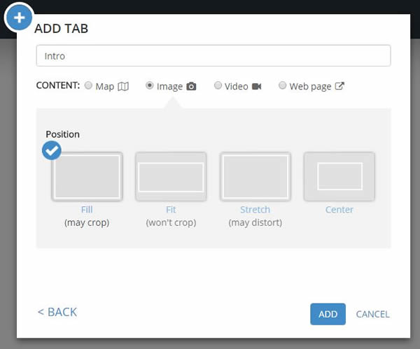 Make sure that the Position default is Fill. This will fill the first tab of your story map with your image. If you use an infographic or other image that you want to make sure doesn’t get cropped at different browser widths, you would use Fit instead of Fill. Enter Intro as the title of your tab.