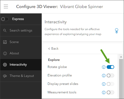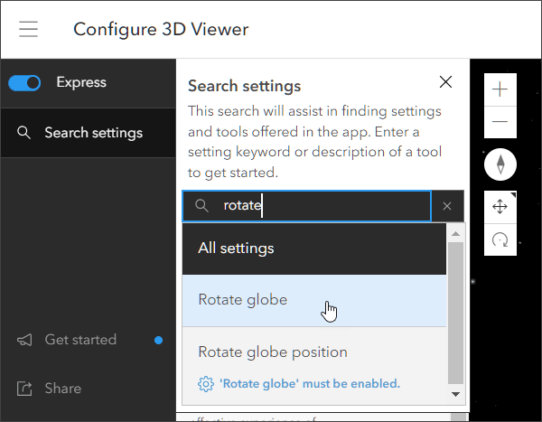 All Instant Apps templates open in the express setup mode, providing access to essential settings. One of the tools not found in express mode for 3D Viewer is the Rotate globe tool.